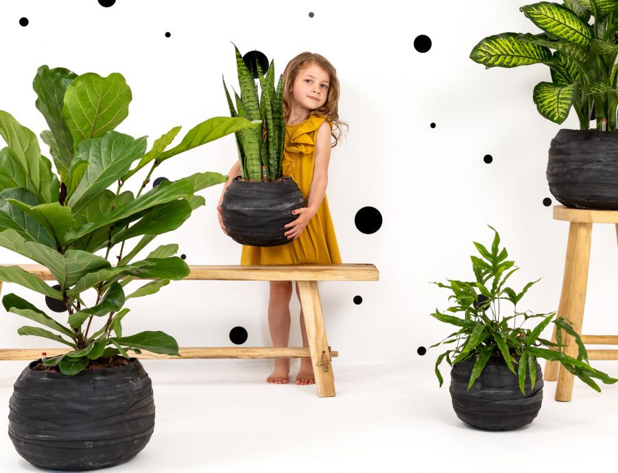 De stoere rubberen potten zijn gemaakt van oude fietsbanden. Hoe leuk is dat! Soms kom je zelfs nog een geplakte band tegen. Zet er een aantal bij elkaar en je hebt meteen een hele stoere look.