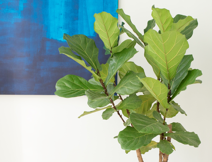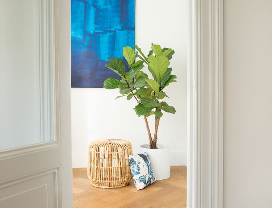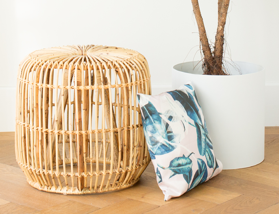Deze combinatie van een mat witte strakke ronde bak en de grote bladeren is één van de meest geliefde pot-plant combinaties van dit moment op pinterest. Het krukje en het kussen maken het een gezellig hoekje om te zitten.